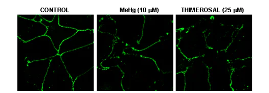 Was man hier auf dem Bild sieht: Links ist eine gesunde Darmzelle, die in Kontakt mit Quecksilber bzw. Thimerosal (enthält ebenfalls Quecksilber; findet sich z. B. in Impfungen; Bild mittig und rechts) kommt. Zu erkennen ist, dass Darmzellen ihre Integrität verlieren. Heißt, hier entsteht im Prinzip ein durchlässiger Darm („Leaky Gut“), da Quecksilber dafür sorgt, dass die Darmzellen nicht mehr fest aneinander „kleben“ (s. Abbildung unten).