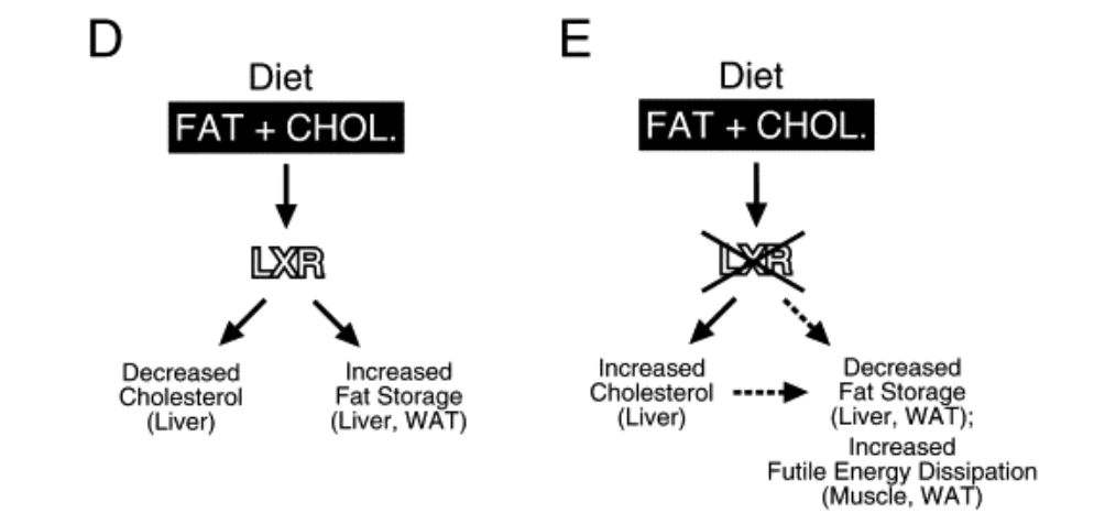Cholesterin bindet in der Leber an sogenannten LXR-Rezeptoren. Diese LXR-Rezeptoren, wenn aktiviert, stimulieren die Lipogenese (Fettneubildung) und unterdrücken die Fettverbrennung über einen anderen Schalter namens SREBP-1c. Diese Cholesterin-bindenden LXR-Rezeptoren bestimmen über das basale Niveau dieses SREBP-1c-Schalters als auch über das Niveau, das durch Insulin reguliert wird. Zusätzlich wird die Kohlenhydratspeicherung forciert und die Neubildung (Gluconeogenese) gehemmt. Dies entspricht allgemein einer Energiespeicheurng. Schaltet man diese LXR-Rezeptoren aus, sind die Tiere geschützt vor Fettleibigkeit und Stoffwechselentgleisung, stattdessen fährt der Organismus global (also auch im Muskel) Systeme hoch, die die Energiefreisetzung stimulieren. Das lässt sich wie folgt in Form einer Grafik zusammenfassen: