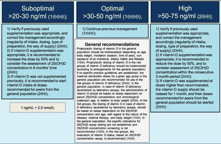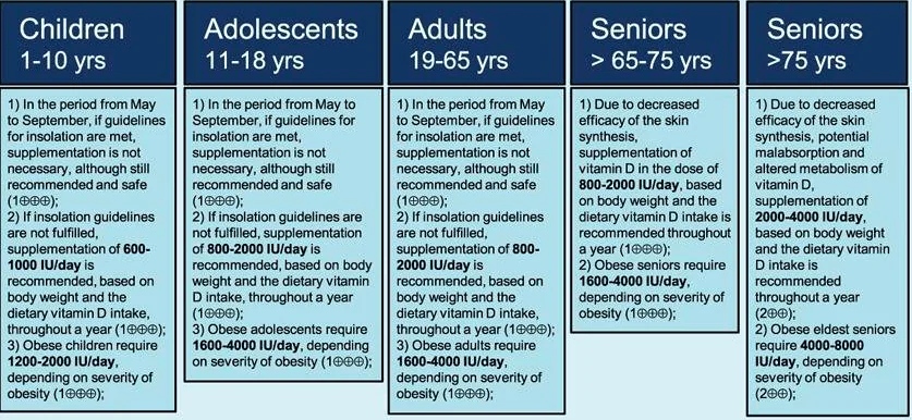 Rusińska, A., Płudowski, P., Walczak, M., Borszewska-Kornacka, M., Bossowski, A., & Chlebna-Sokół, D. et al. (2018). Vitamin D Supplementation Guidelines for General Population and Groups at Risk of Vitamin D Deficiency in Poland—Recommendations of the Polish Society of Pediatric Endocrinology and Diabetes and the Expert Panel With Participation of National Specialist Consultants and Representatives of Scientific Societies—2018 Update. Frontiers In Endocrinology, 9. doi: 10.3389/fendo.2018.00246
