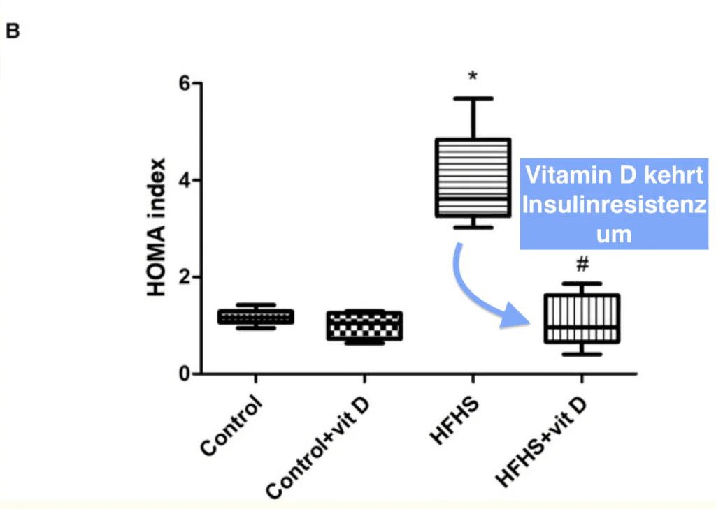 Vitamin D reduziert das Körpergewicht und verbessert die systemische Glukosetoleranz. Darüber hinaus stellte Vitamin D die Wirkung von Insulin auf den Muskel wieder her und kehrte die durch die Ernährung hervorgerufene Verfettung des Muskels um.